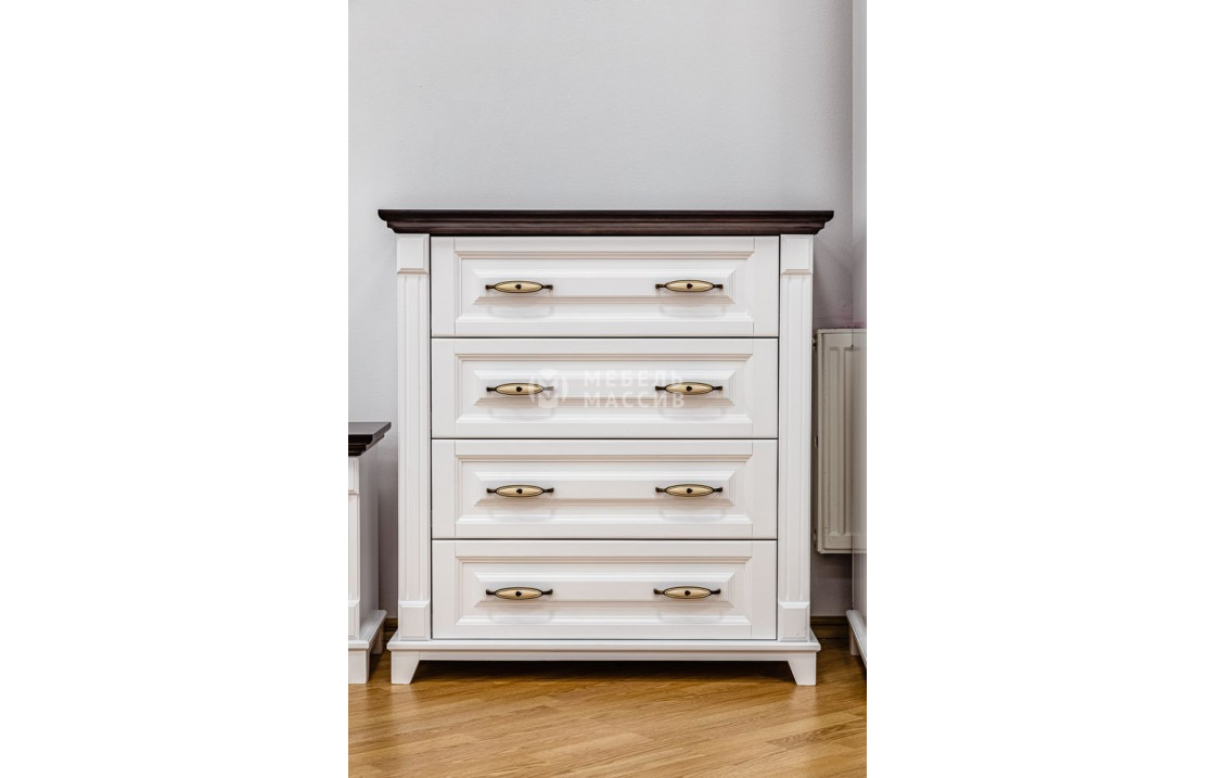 искусно выполненный Комод Прованс Браун (белая эмаль + Венге 3) сделан из массива сосны, имеет четыре вместительных ящика с ручками, декоративную резьбу и ножки для защиты напольного покрытия. цвета основания и столешницы контрастируют с цветом корпуса и ящиков. изделие можно купить в интернет-магазине по выгодной цене.| Размер | Цена | |