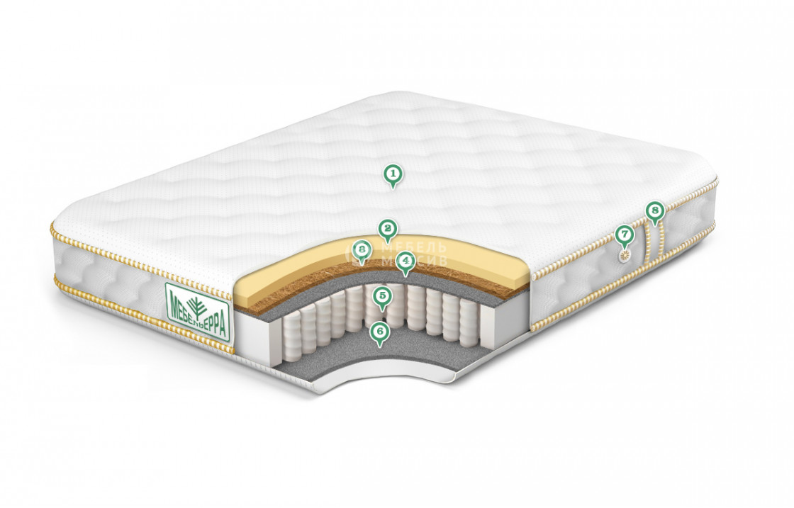 6. Кокос 1 см ? Кокос - переплетенные волокна кокосового ореха, растительного происхождения. Исключительные свойства кокоса в прочности, упругости и гигиеничности. Материал придает жесткости матрасу. Обладает отличной вентилируемостью, устойчив к любой влажности и перепадам температуры, гипоаллергенный и долговечный.