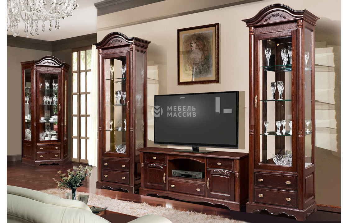 Для оформления гостиной комнаты был создан комплект Валео. Он состоит из двух небольших шкафчиков и тумбы под ТВ. Шкафы имеют стеклянные полочки за прозрачными дверками. На них можно расположить элитную посуду или элементы декора. Ниже имеются выдвижные ящики для хранения соответствующих аксессуаров. Тумба для ТВ имеет подходящую нишу для размещения в ней электроники. Мебель снабжена несколькими выдвижными ящиками и полочками за непрозрачными распашными дверками. В качестве украшения дизайнеры использовали резьбу по дереву и инкрустацию декоративными элементами. Доставка по Твери и Тверской области.| Размер | Цена | |